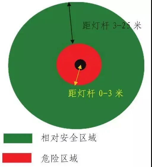 (一)以灯杆为中心,半径25米和半径3米所组成的同心圆环区域(安全),雷闪时附近人员可以在此短暂躲避,躲避时人员需注意要下蹲并双腿靠拢。